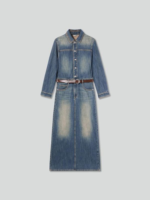 Crafted from breathable Tencel, this denim fabric offers a soft, smooth, and lightweight feel, combining Tencel’s gentle drape with denim’s strength for a refined wearing experience. The vintage light blue wash enhances its timeless appeal, while a brown belt cinches the silhouette, adding effortless elegance. A suede label enriches the retro vibe with thoughtful details, and the back slit hem design introduces a modern, sensual touch, elevating the outfit’s overall style.