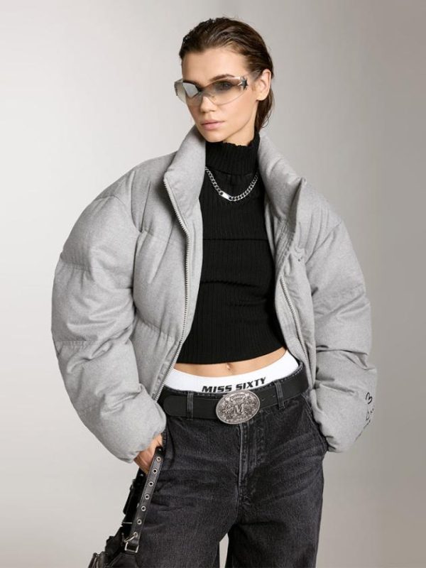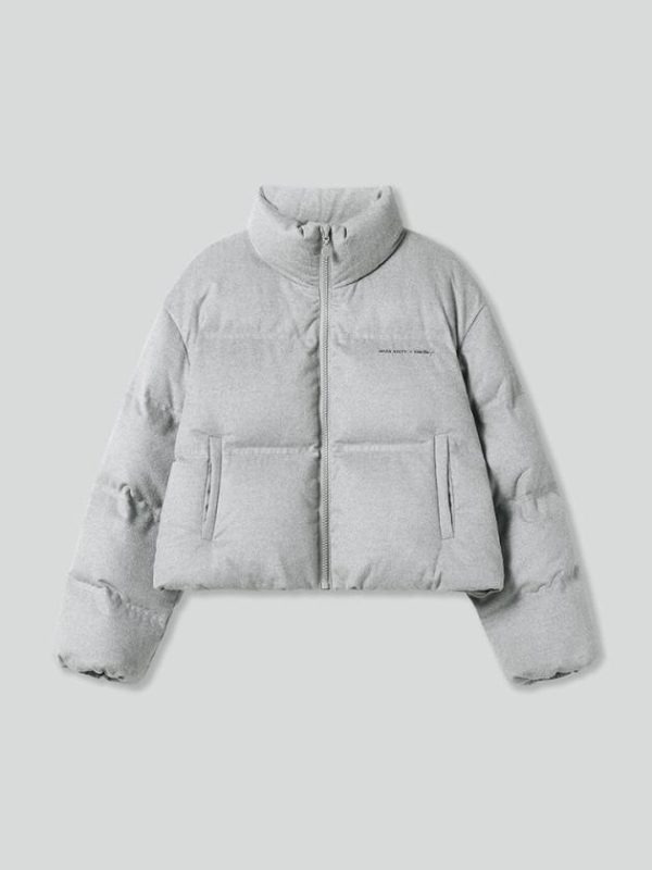 Crafted from a premium wool blend fabric, this piece features a soft and naturally lustrous surface. The blended yarns offer a delicate, smooth feel with a lightweight and tightly structured fabric. Filled with 90% duck down, it provides a fluffy, lightweight warmth for a cozy wearing experience. The minimalist stand collar design wraps comfortably around the neck, offering gentle warmth and wind protection. The collaborative logo, presented as embroidery, enhances its premium appeal with an elevated touch. Dual angled side pockets add functional detail, boosting overall practicality.