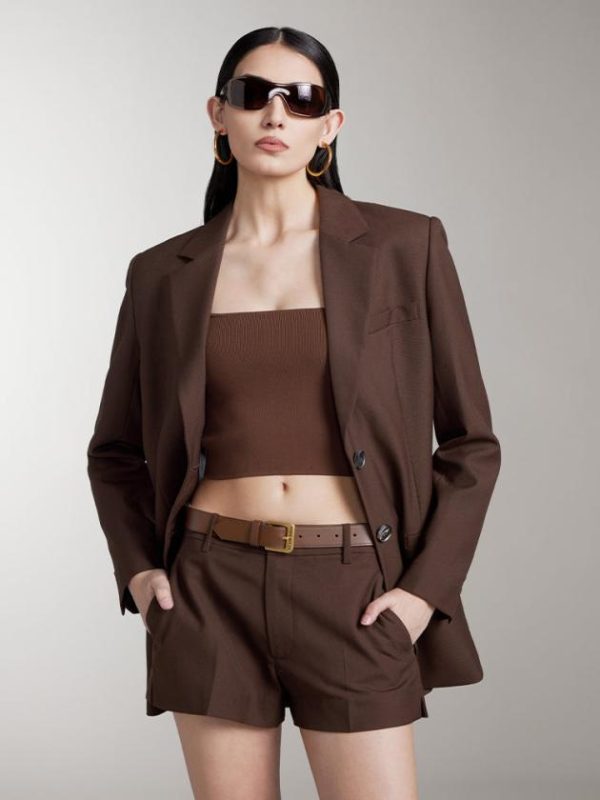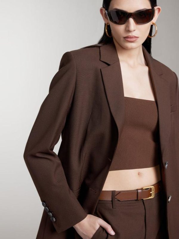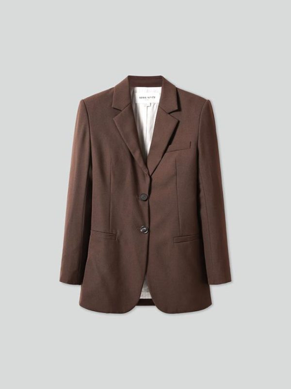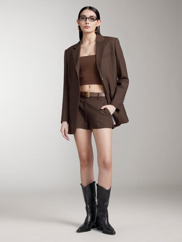 Made from finely spun wool, this fabric boasts a smooth, clean surface with a tight, clear weave. The high wool content lends the material a premium quality, with wool fibers, often called the “gem of fibers,” providing a lightweight feel. The garment is soft, structured, and full-bodied, offering a rich texture and a sharp, sophisticated appearance. The classic notch lapel design is easy to style in a casual, modern way. The back belt detail adds a deconstructed element, breaking the formality of a traditional suit and adding a touch of personality. The curved hemline enhances the garment’s structure, giving it a fluid and refined silhouette.