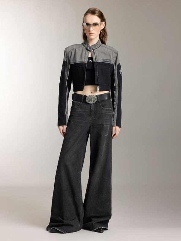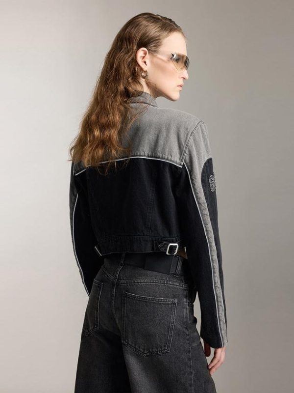 Made from black warp and weft non-stretch fabric, with a precise yarn ratio, this piece undergoes enzyme wash and light wash treatments for clear textures. The patchwork with light-colored fabric showcases a slub style, giving each piece a unique look that interprets the vintage denim texture and design. The snap-button stand collar adds a touch of outdoor utility. Functional embroidered patches with a racing theme are eye-catching and stylish. The short cut enhances proportions, and the adjustable waistband details ensure a flattering fit that contours the waist.