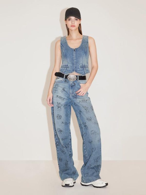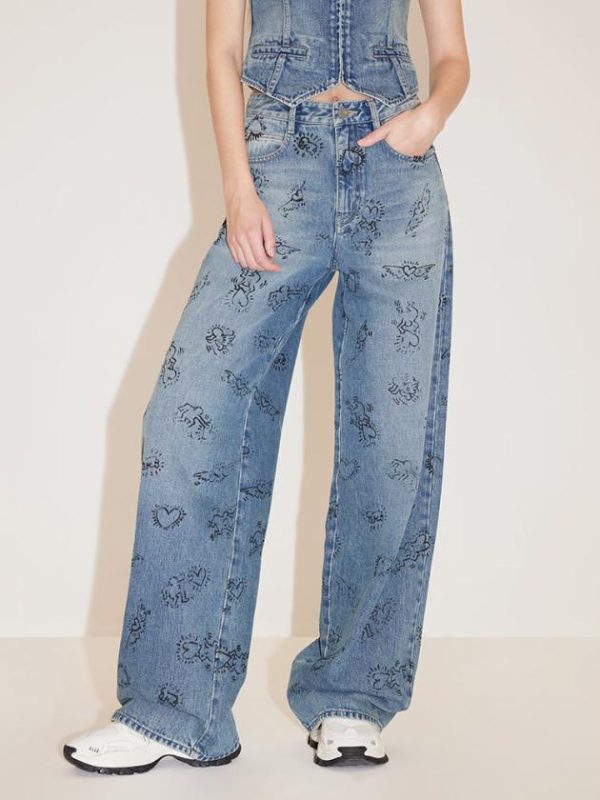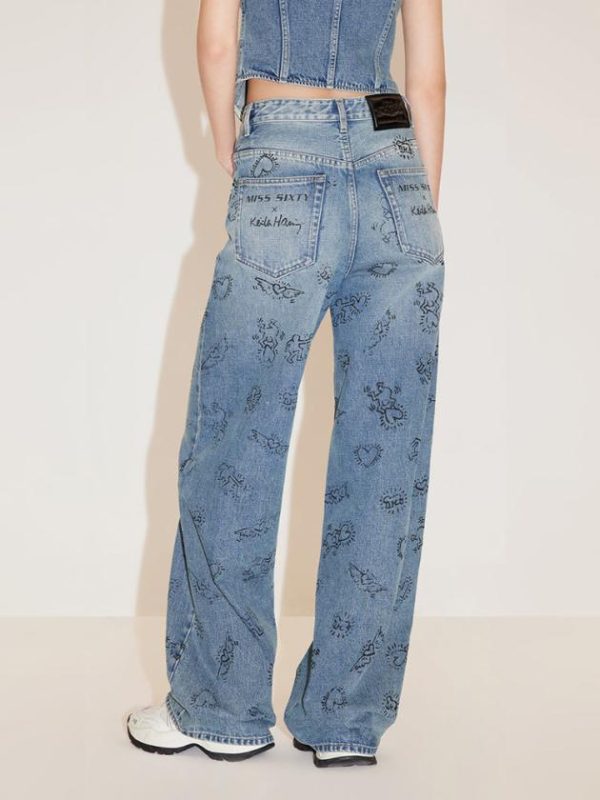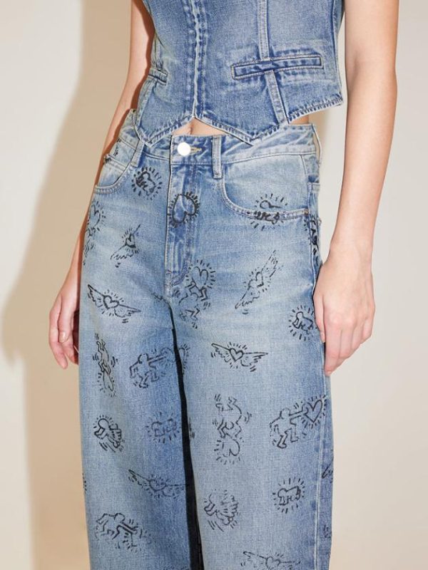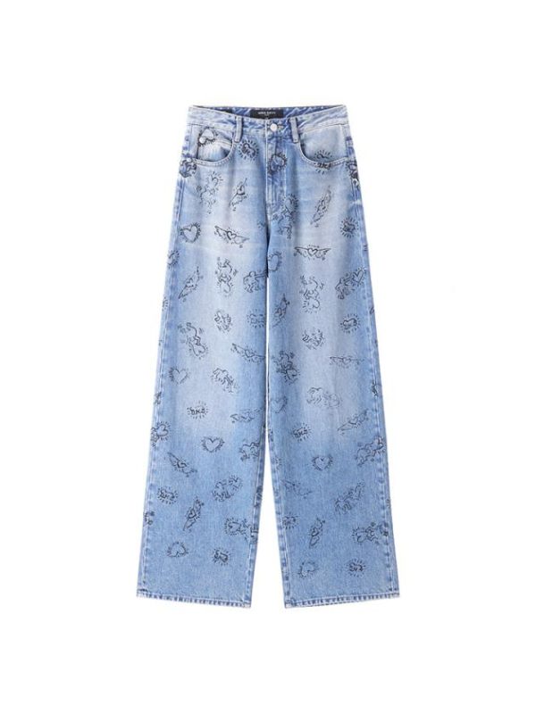 Carefully selected pure cotton denim fabric, providing a full and robust texture with a broad appearance. The fabric features a full-width printed design, echoing the theme. The high-waisted slim-fit silhouette, combined with the bleached wash technique, exudes a variety of retro nostalgic vibes. The embossed effect on the leather label adds a unique and eye-catching touch. With the collaborative printed pattern, it creates a strong visual impact and artistic sensation.