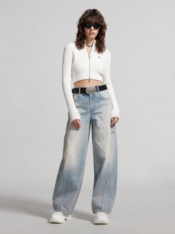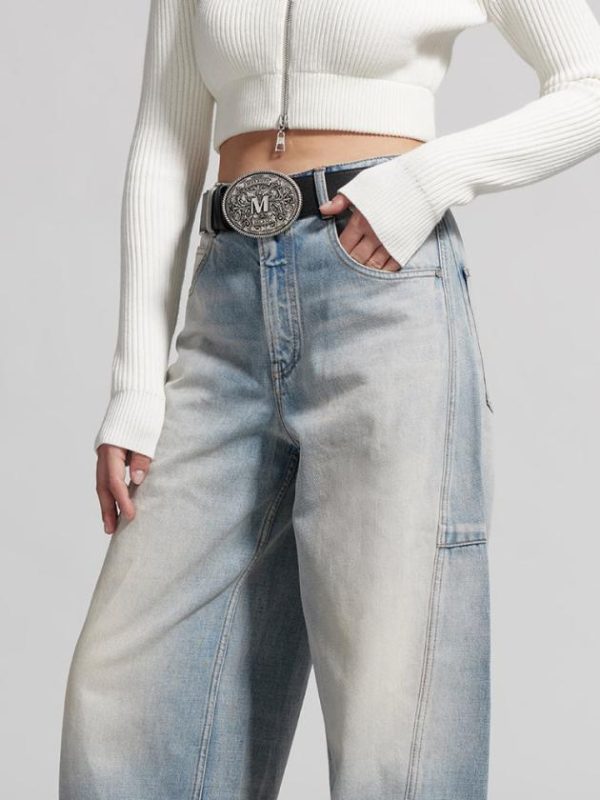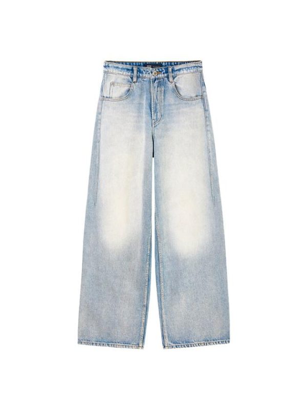 The denim fabric has a full and rich texture, a broad and sturdy silhouette, and undergoes multiple washes and craftsmanship to present a nostalgic denim style. The distressed and bleached design adds a vintage touch. The paper-like leather patch, combined with the brand’s embroidered logo, adds a unique and playful touch. The wide-leg design enhances a slim and elongated look for the legs.