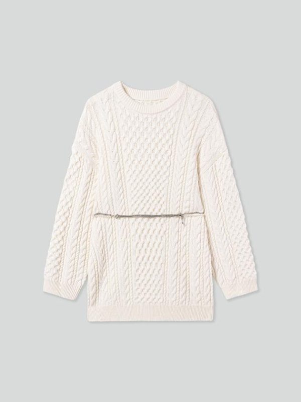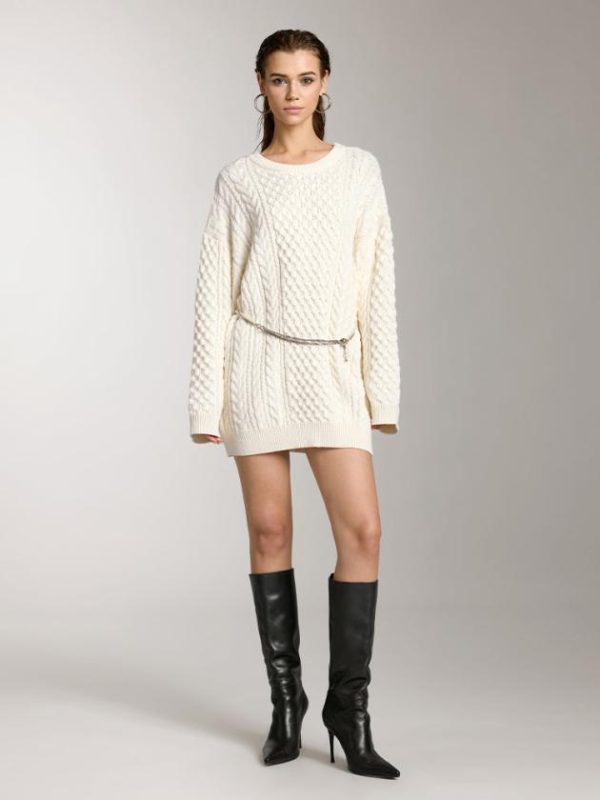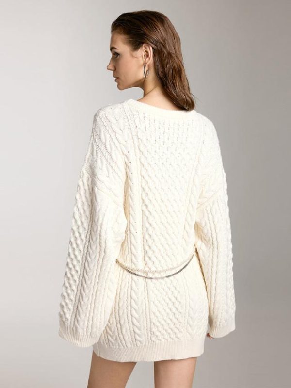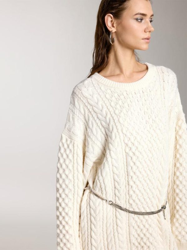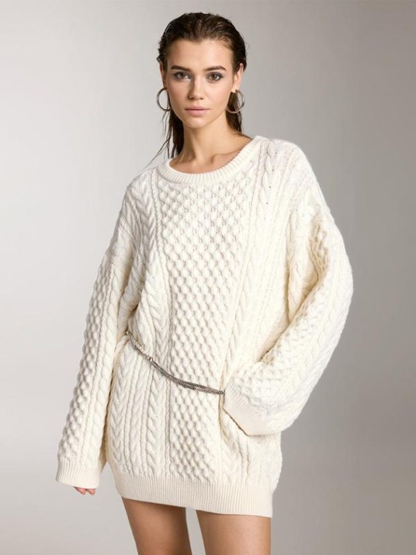 This fabric is a blend of lightweight, fluffy wool and acrylic fibers, resulting in a soft, delicate, and smooth texture. The comfortable elasticity creates a resilient texture, offering a warm and structured wearing experience. The ribbed round neckline is snug and well-shaped, giving a simple yet elegant appearance. The adjustable metal waist chain with pearl accents adds a touch of romantic charm. Long sleeves comfortably envelop the arms, subtly concealing any imperfections, for an elegant and casual look.