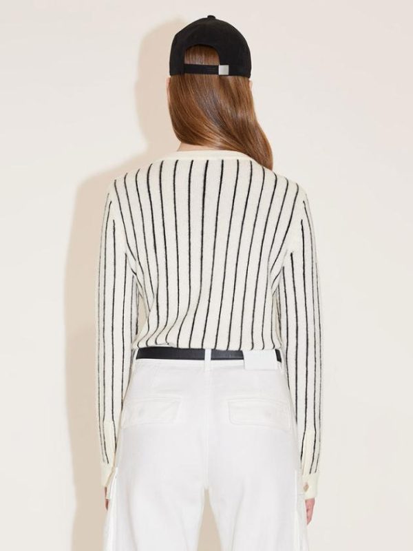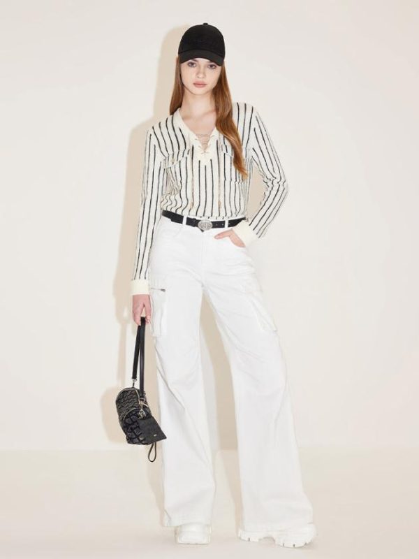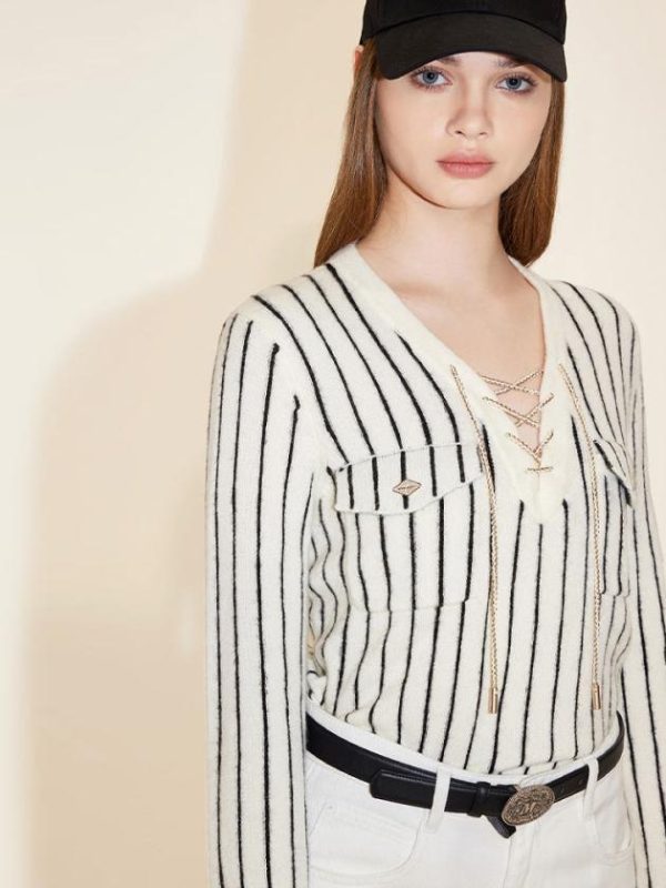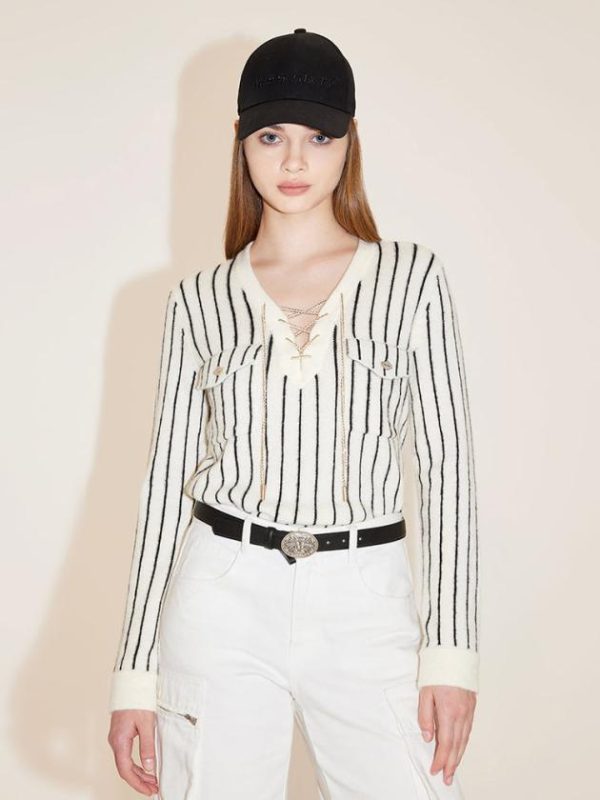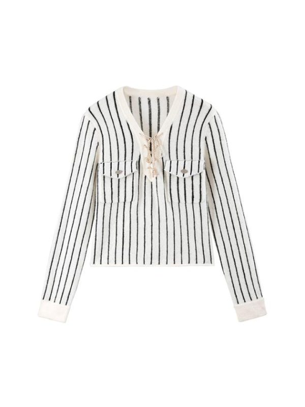 Selected wool-blend fabric, with a surface that boasts a soft and natural sheen, blending yarn for a soft and delicate touch, and a lightweight texture for comfortable and pleasant wear. The classic V-neck striped knit sweater, featuring a chain tie with unique design, effortlessly creates a smart look and opens a new season of elegant fashion.