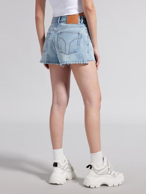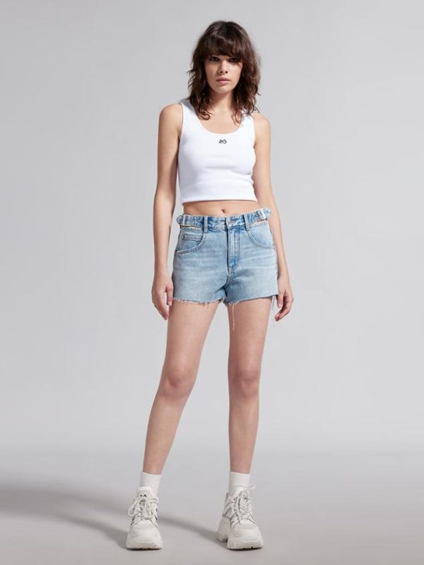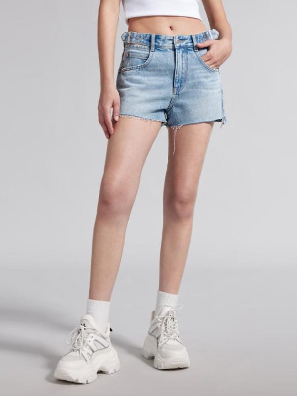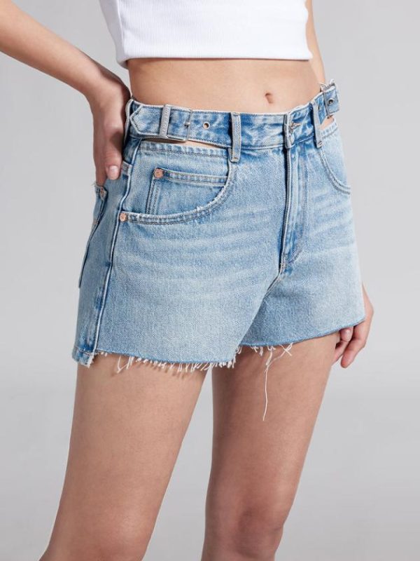 Carefully selected cotton denim fabric, comfortable to the touch, with clear textures, undergoes multiple processes to achieve a deep blue vintage wash, presenting a unique retro style. The design features a sensuous hollowed-out waist with an adjustable waistband, embodying individualistic fashion trends. The textured leather label combined with the hip-enhancing York line, along with irregularly frayed pocket edges, adds distinctive character. The design of short front and long back trouser legs, adorned with irregular frayed edges, exudes a full-on vintage street style.