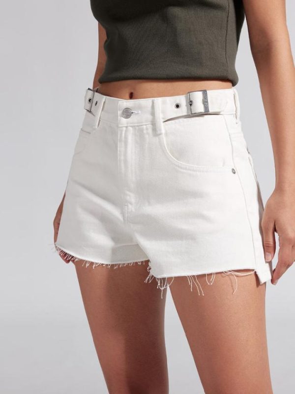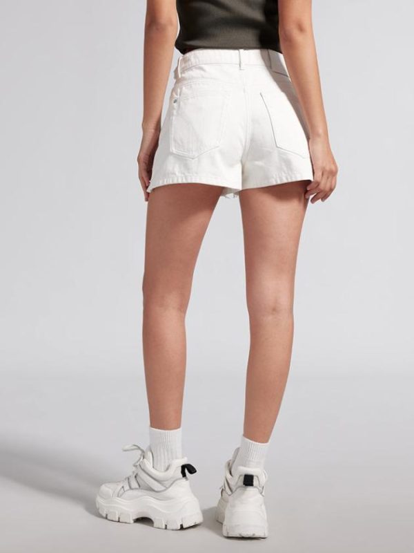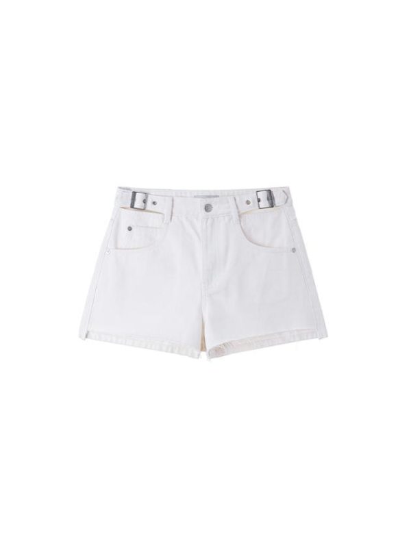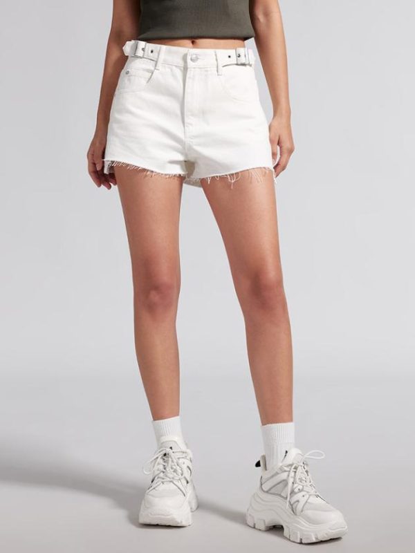 Carefully crafted from cotton denim fabric, the white color exudes a refreshing and natural feel, with a soft and comfortable hand feel, clear and distinct texture, and smooth and delicate surface. The waist features a sexy hollow design adorned with adjustable waist straps. The textured leather label combined with the back yoke line enhances the visual effect of lifting the buttocks. The irregularly frayed edges of the pockets add uniqueness to the design. The front short and back long trouser leg design exudes a full vintage street style.