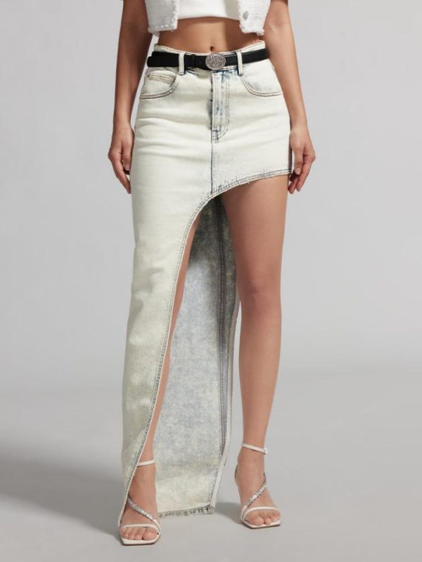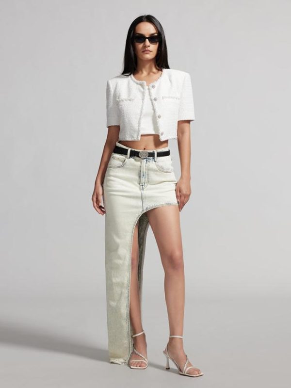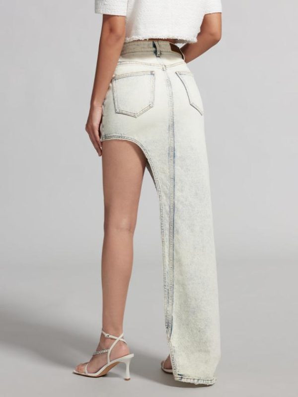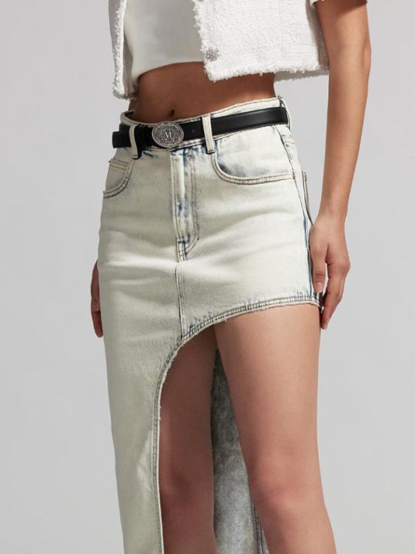 Cotton denim fabric with a soft and skin-friendly feel, featuring a low stretch twill weave that offers good comfort and flexibility. The low-rise cut adds a touch of American vintage flair, accentuating a visually slim waistline. Mini brown leather patches and vintage distressed washing complement each other, enhancing the curve with York lines. The deconstructed cut creates an asymmetrical hemline, with just the right amount of skin exposure to exude sensual charm.