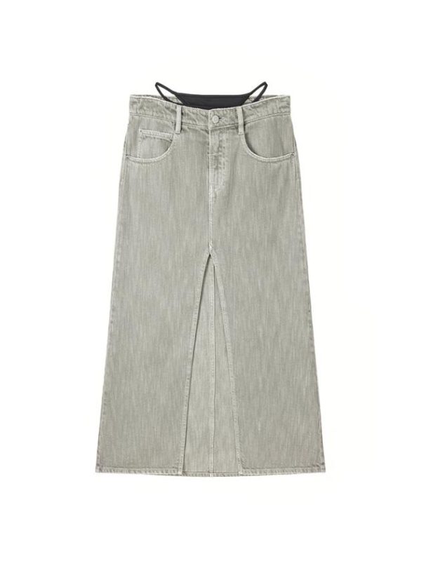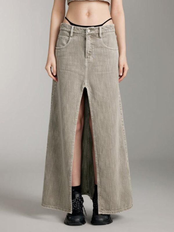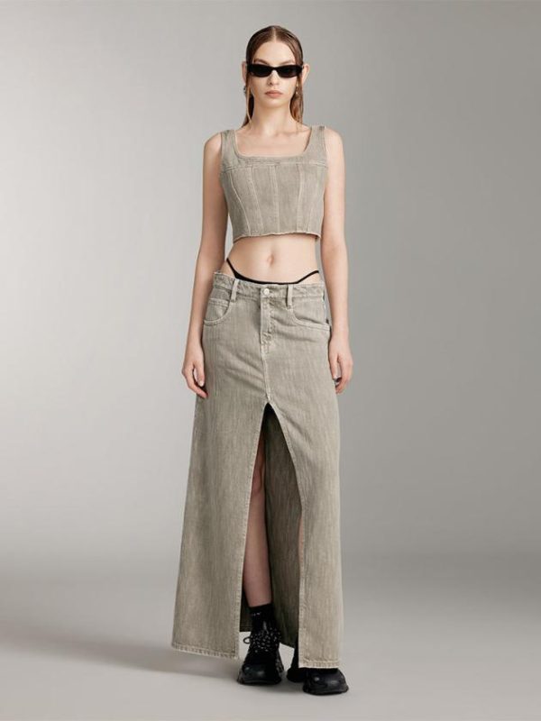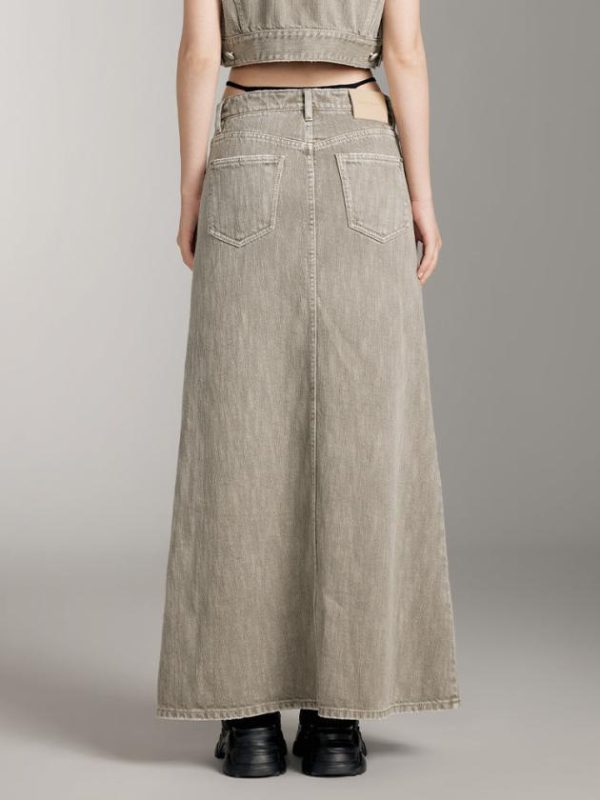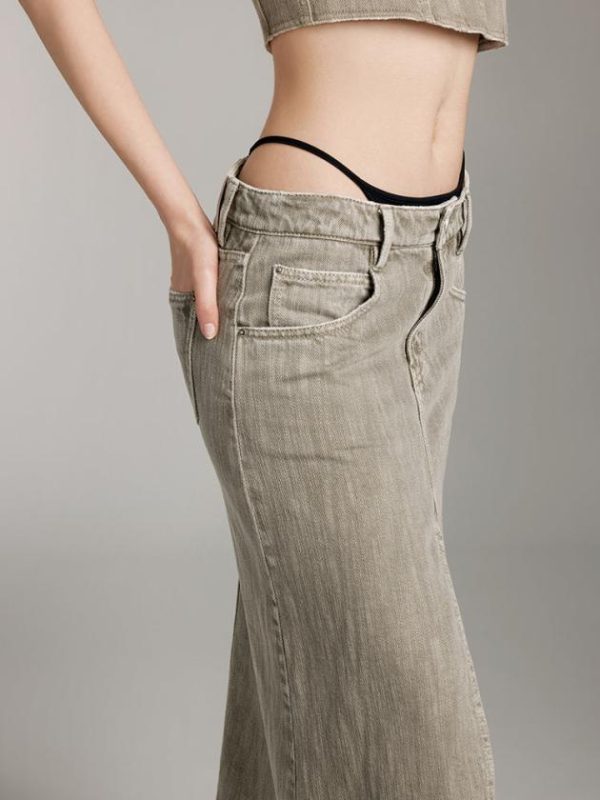 Made from high-quality long-staple cotton, this fabric boasts a refined texture. The all-cotton composition lends the fabric a good hand feel. The special bamboo design blends nostalgia with comfort, while the trendy gray-green color makes it easy to wear and match. The waist detail, reminiscent of a bikini, accentuates the waistline, offering a sensually appealing look. The vintage leather patch and washed-out style complement the York lines to enrich the details around the hips. With a front slit skirt, it subtly reveals leg contours as you walk, adding a touch of allure.