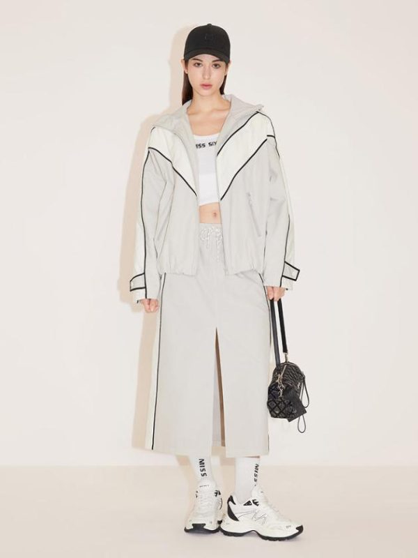 Cotton and polyester trench coat fabric, high-density craftsmanship gives the fabric a subtle ladder pattern on the surface, providing a dry and comfortable feel with a unique texture. The fabric maintains a crisp and structured appearance. The bold and avant-garde front slit design, combined with a touch of ingenuity, blends in light sporty elements, bringing forth a vibrant and fashionable vibe for the new season.