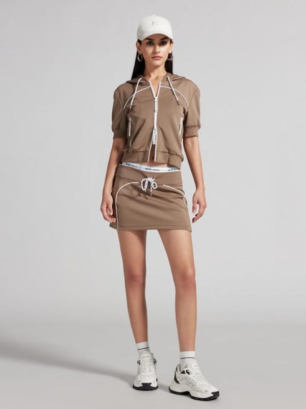 Crafted from a blend of polyester yarns, it highlights the polyester’s style while offering the elasticity and comfort of spandex fibers. The fabric boasts a soft, smooth touch and feels good against the skin, with a crisp and easy-to-care-for quality. The design features contrasting color drawstrings with adjustable elasticity at the waist, providing comfortable support. The waistband with fine ribbing adds a touch of sporty style, while the logo tape detailing enhances the waistline, creating the illusion of longer legs. The short skirt silhouette is both sexy and playful, with a U-shaped contrasting color stripe that adds a sporty vibe.