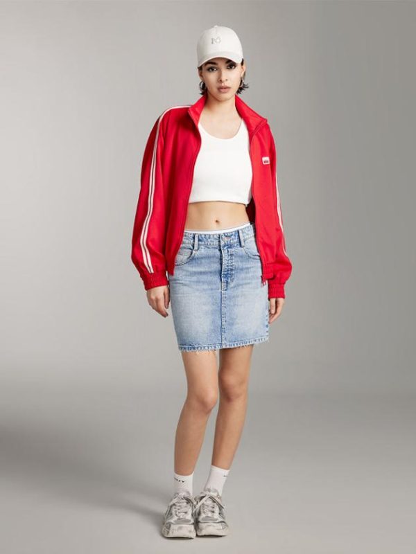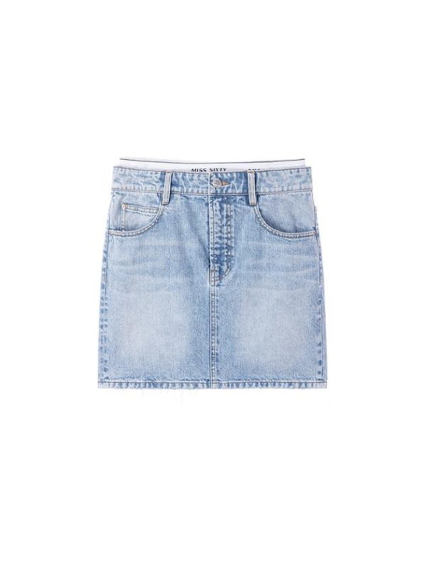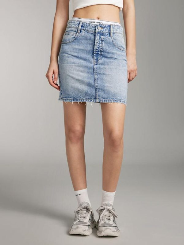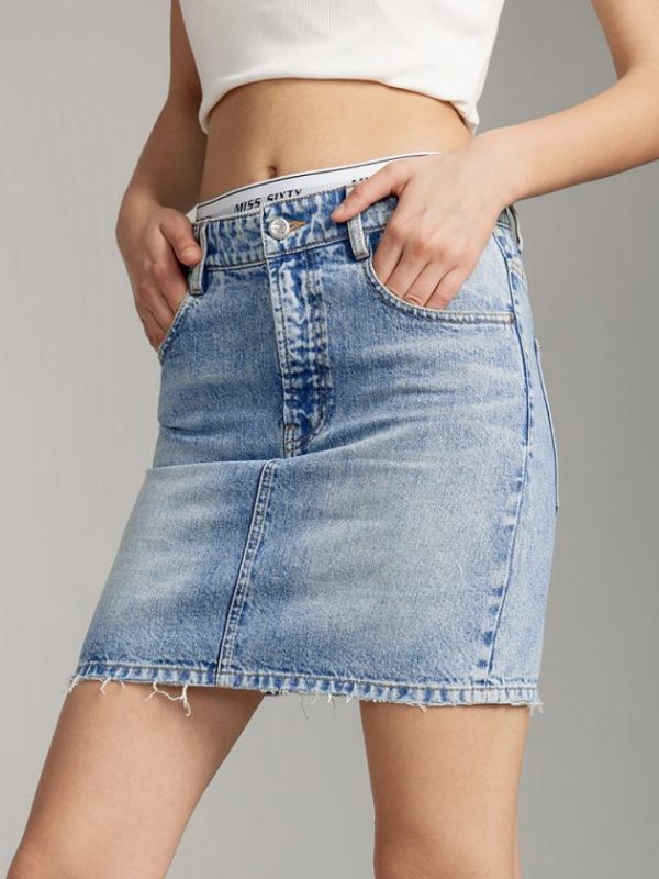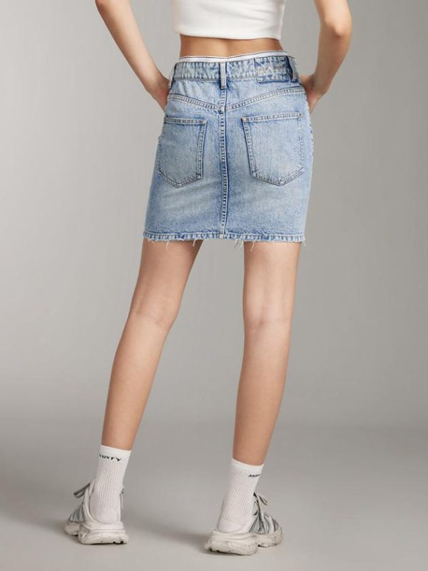 Crafted from selected Turkish textured denim fabric, this material offers a comfortable feel with moderate thickness and a unique reverse waffle pattern, creating a natural vintage look. The design features a distinctive double waistband for a layered style. The logo on the fabric tag enhances brand recognition and sophistication. The skirt hem with distressed detailing adds individuality, creating a fashionable and edgy high-street vibe.
