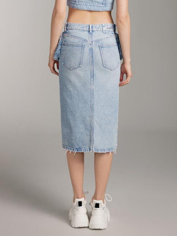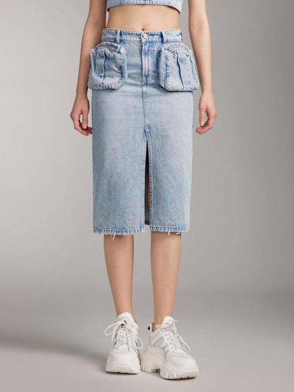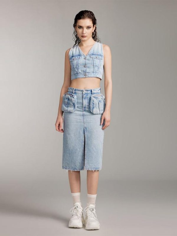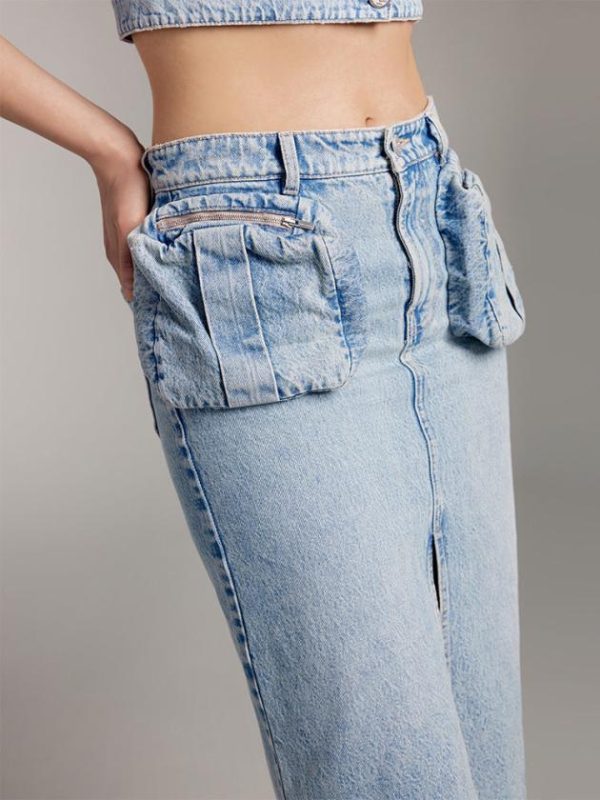 The MARBLE X fabric in the retro collection features a rugged texture with a nostalgic vibe, showcasing significant stone grinding effects. Through processes like enzymatic grinding, whiskering, and multiple washes, it exudes the natural vintage denim texture and character. The utility-style zippered pockets add depth to the outfit’s visual appeal, highlighting a unique personality. Eye-catching logos adorn the fabric label, while the York seam combined with patch pocket design visually cinches the waist and accentuates the hips. The split hem design and distressed details present a gradually evolving fashionable visual.