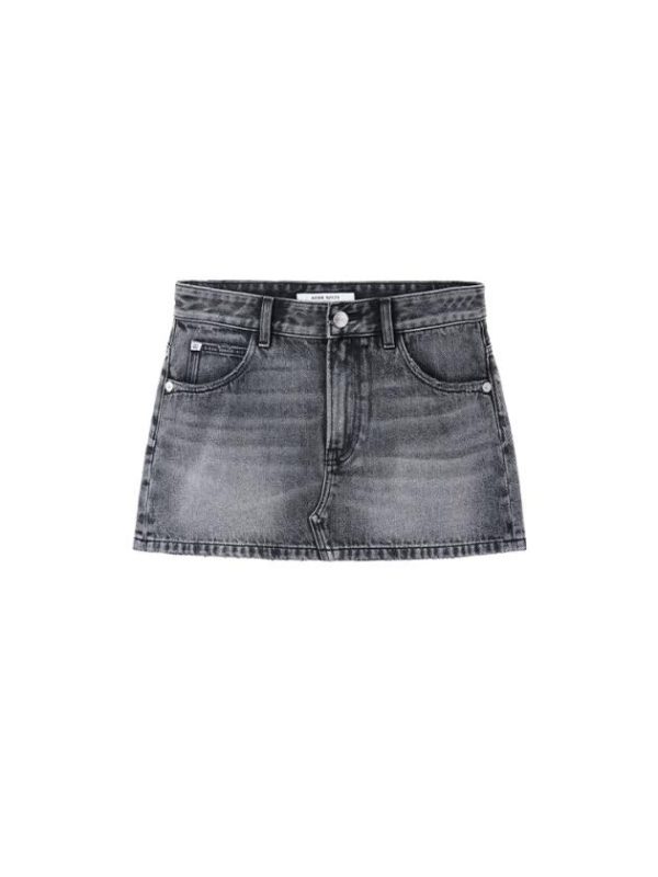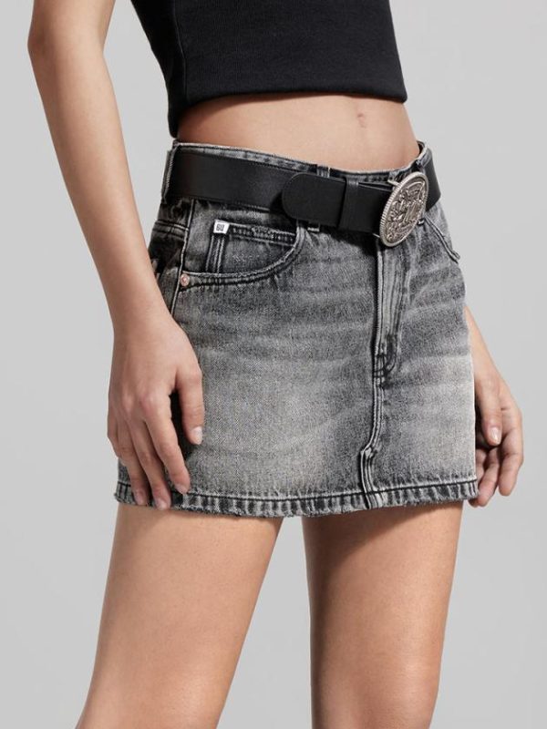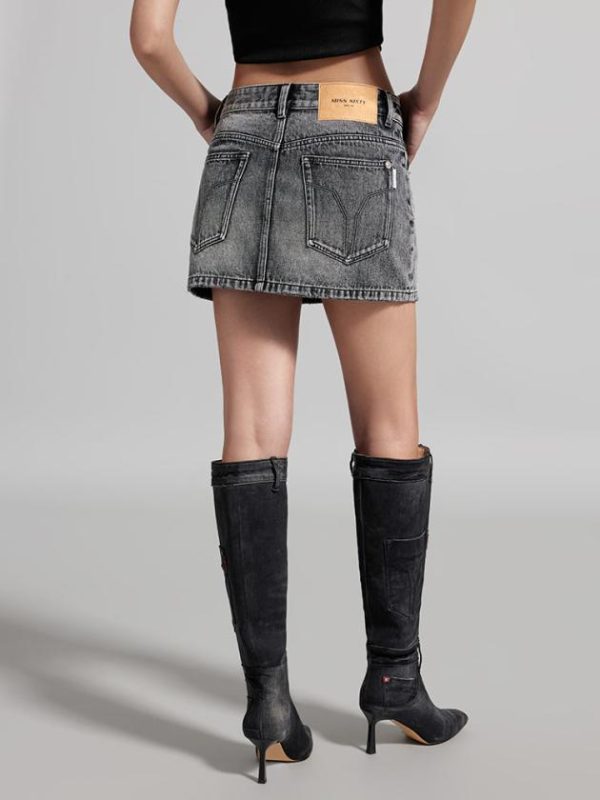 Carefully selected Turkish denim fabric, featuring a rugged texture with distinct bamboo-like patterns in both warp and weft, presenting a high-end vintage denim style. Low-rise silhouette with irregularly distressed pocket edges for a unique look. The brown leather patch contrasts visually with the retro black-gray tones, enhancing a modern sense of strength. Irregular distressed design on the skirt hemline, showcasing an unrestrained attitude and individual style.