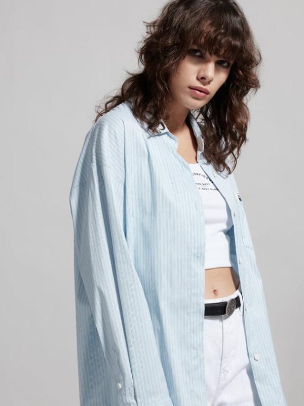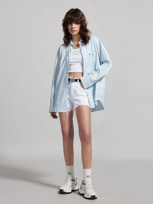 The fabric is meticulously crafted using combed cotton yarn in the warp direction, resulting in minimal lint and a clean, smooth surface. High-quality spandex is employed in the weft direction to provide excellent elasticity, while the silk-like finishing process gives the fabric a smooth and delicate texture, ensuring a soft and skin-friendly feel. The unique silicone badge embellishes the pockets, adding richness to the details and highlighting the brand’s value. The back features a zigzag pleat design to accentuate the curvature of the back, creating a shapely appearance when worn. The curved hemline delicately complements the contours of the body, enhancing its graceful aesthetic.