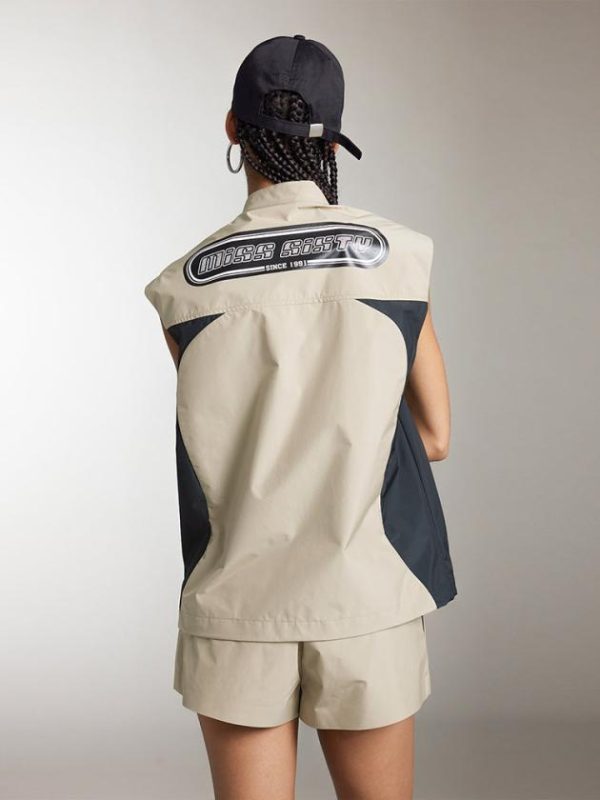 Selected high-density woven polyester is treated for a dry and comfortable feel with a unique texture. The fabric maintains a crisp and structured form, exuding a sleek and stylish look. The small stand collar with snap button design creates a functional aesthetic. The logo printed pattern in black and white is striking and showcases a street-style vibe. Symmetrical silicone zipper design adds rich detail, embodying a trendy and sporty flair.