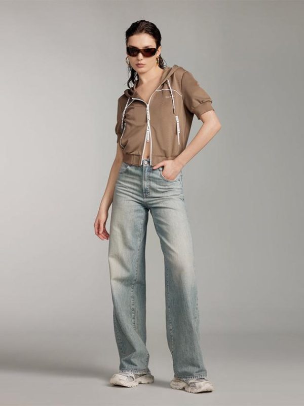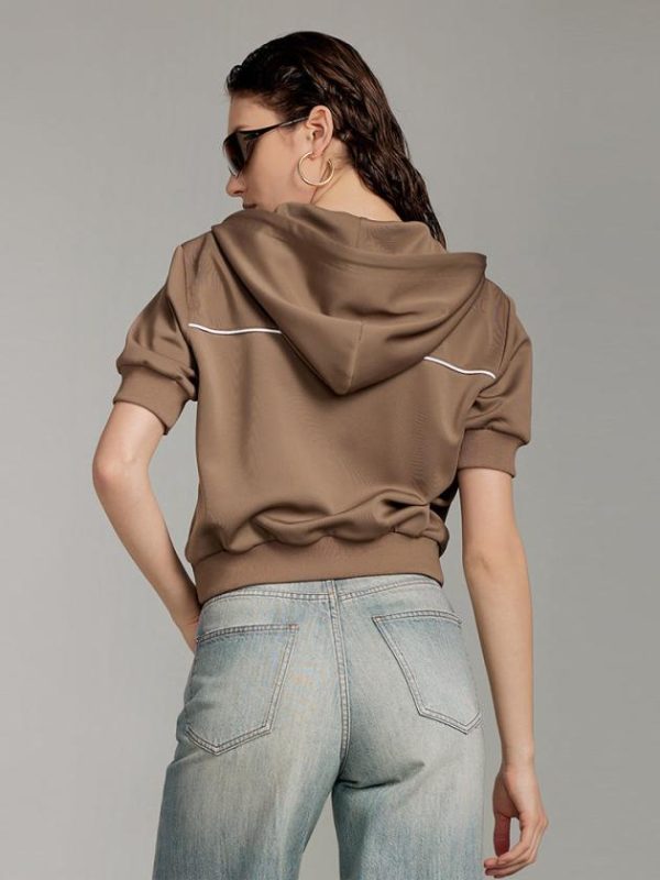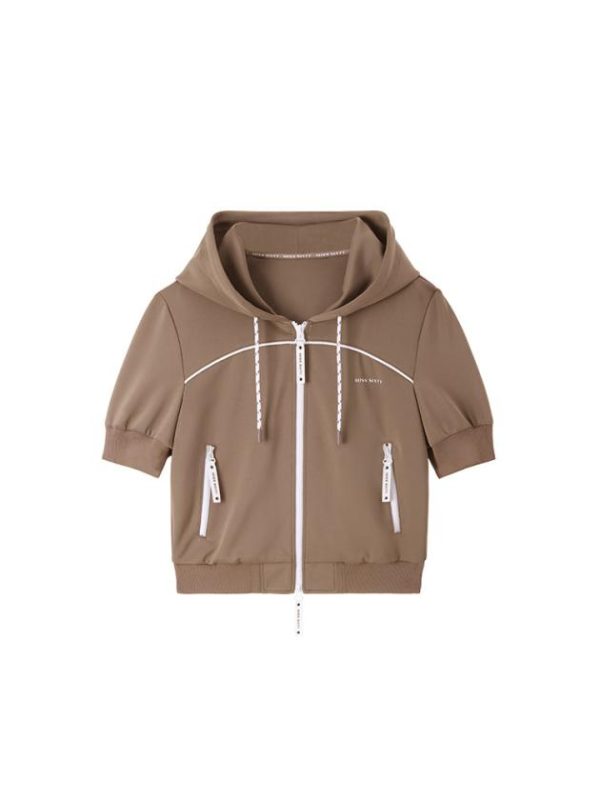 Crafted from polyester yarn interwoven, it highlights the style of polyester while offering the elasticity and comfort of spandex fibers. The fabric feels soft, smooth, and comfortable on the skin, with a firm and stylish texture that is easy to maintain. Featuring a casual hooded design, the logo back collar tape ensures comfort and shape retention, while the contrasting drawstring adds a touch of fashion and personality. The brand logo is delicately embroidered in contrasting colors, showcasing meticulous craftsmanship. With a short-cut design and a two-way zipper, it allows for easy switching between various styles.