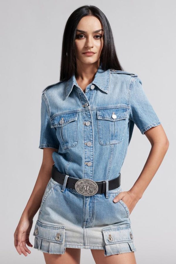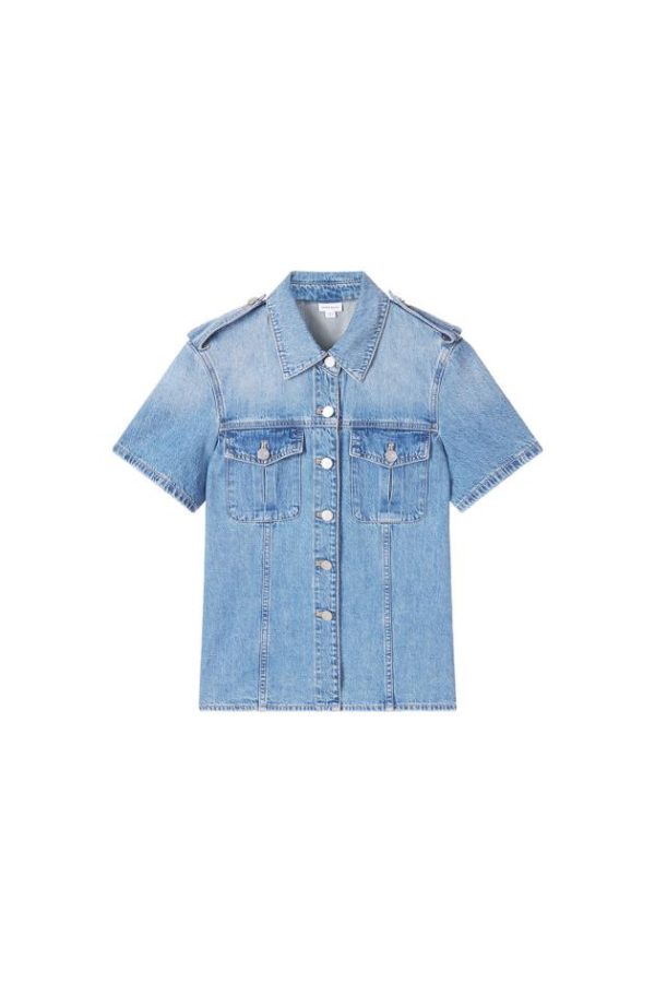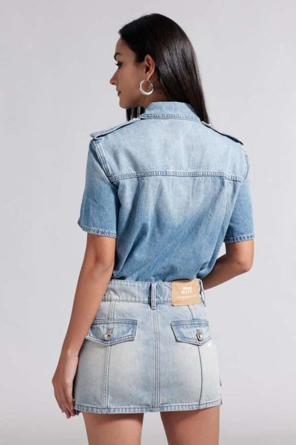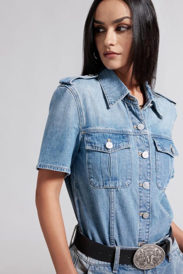 Crafted from premium cotton denim fabric, this piece boasts a naturally saturated hue and a well-structured fit. The addition of shoulder epaulettes adds a touch of retro charm with a dash of ruggedness. Decorative pockets in a utility-inspired style adorn the front, enhancing the casual yet stylish appeal. The hem features multiple seam details, further accentuating its structured silhouette.