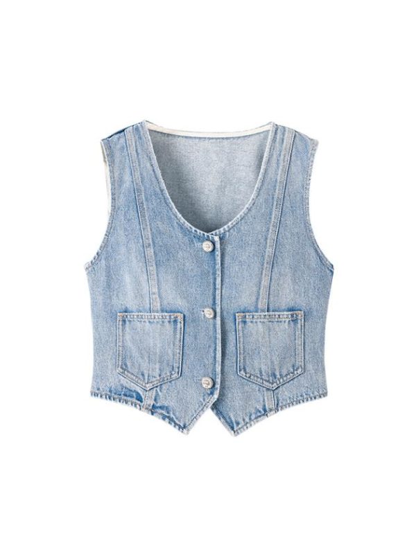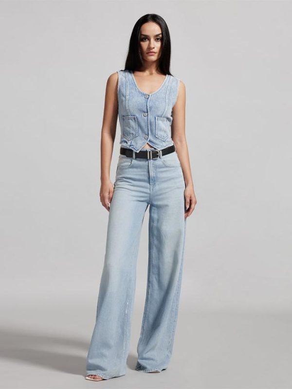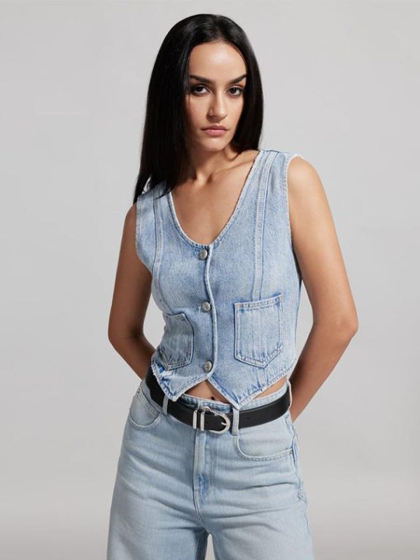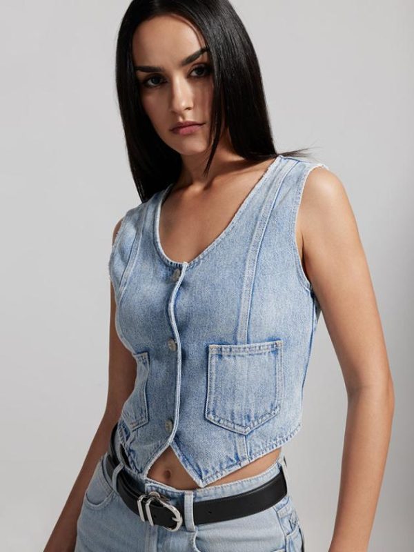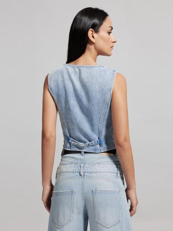 Made with Tencel, the “breathable fiber,” this fabric enhances denim’s drape, boasting a smooth and sleek appearance. Its natural, vibrant color and soft, skin-friendly texture ensure a comfortable fit. The fluid U-neckline design, coupled with custom-branded buttons, creates a standout silhouette. Vertical seams with broken lines structure the garment, visually narrowing the figure for a sleek and confident look. Symmetrical shield-shaped pockets paired with a V-shaped hem highlight its retro charm.